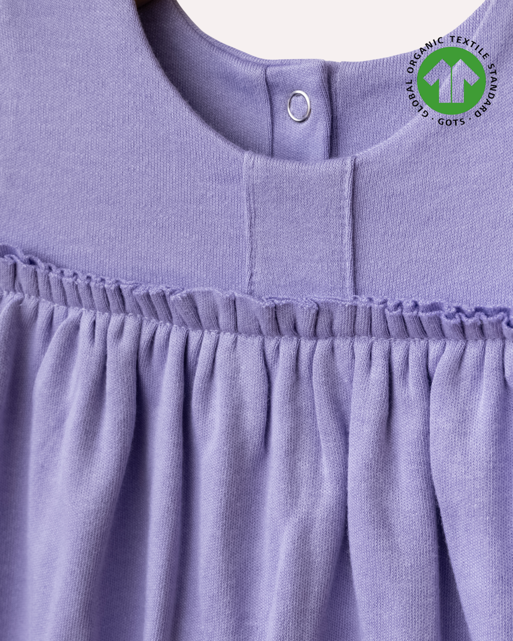 Bebeğinizin gün boyu rahat etmesi için üretilen ORGANİK Mor Elbise, yumuşak dokulu ve tamamen organik pamuk kumaşı ile güvenli kullanım sunar. Kimyasal, sentetik katkı veya sert işlem içermez; bu özelliği sayesinde özellikle hassas ciltli bebekler için idealdir.